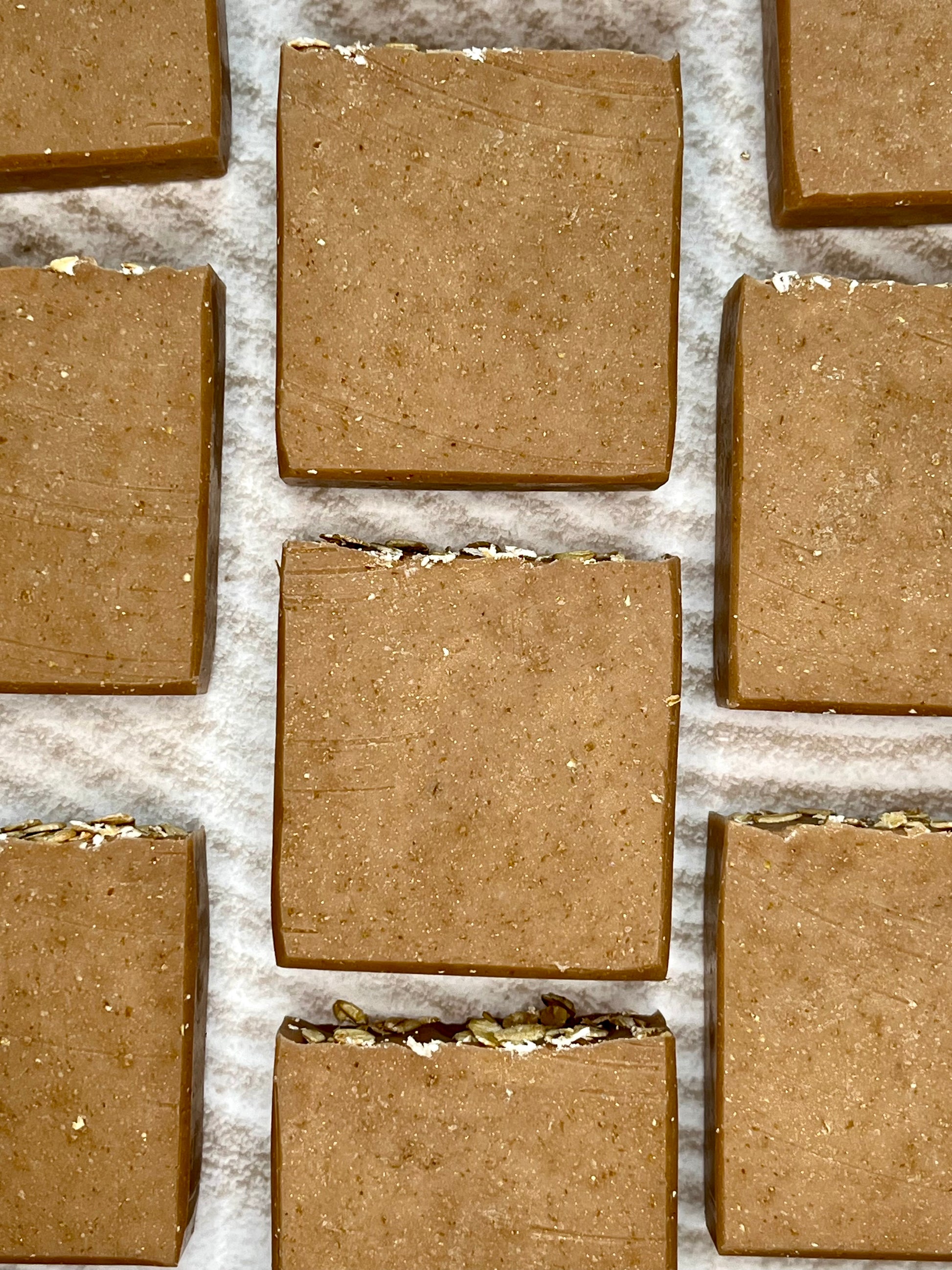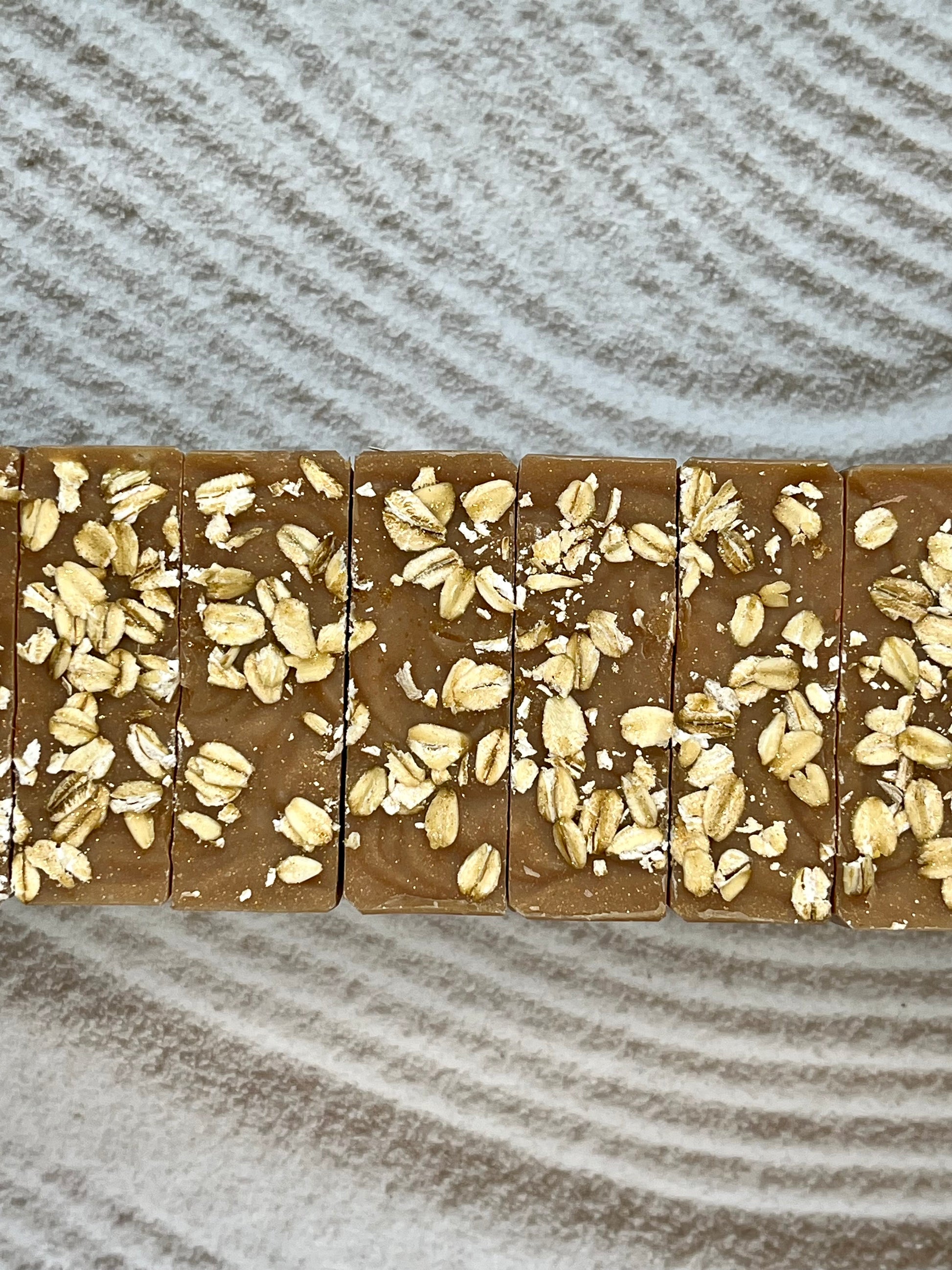 Ingredients: Saponified oils (olive, coconut, sweet almond, castor, avocado), mango butter, goat milk, oatmeal, honey, fragrance, mica